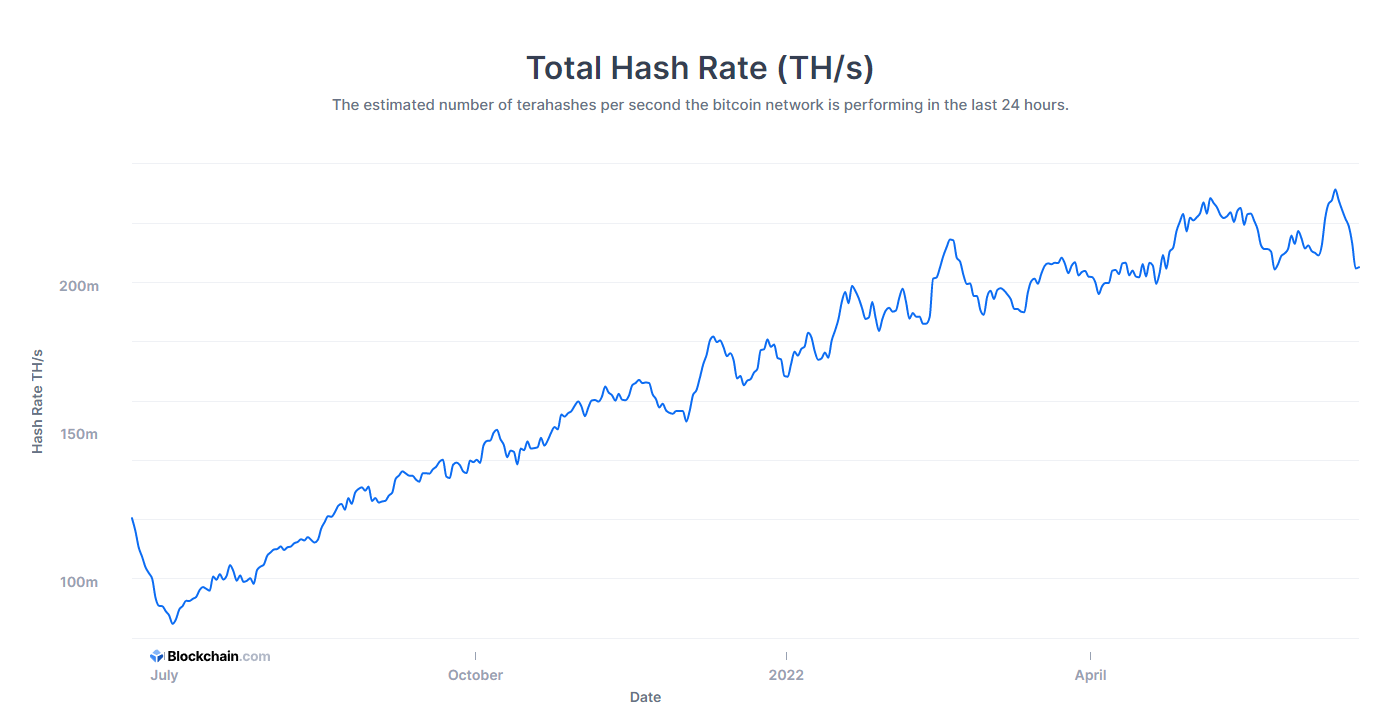 Bitcoin’s current hash rate, also known as Bitcoin’s processing power, fell from an all-time-high (ATH) of 231.428 EH/s on June 12 to 205.163 EH/s at the time of writing.