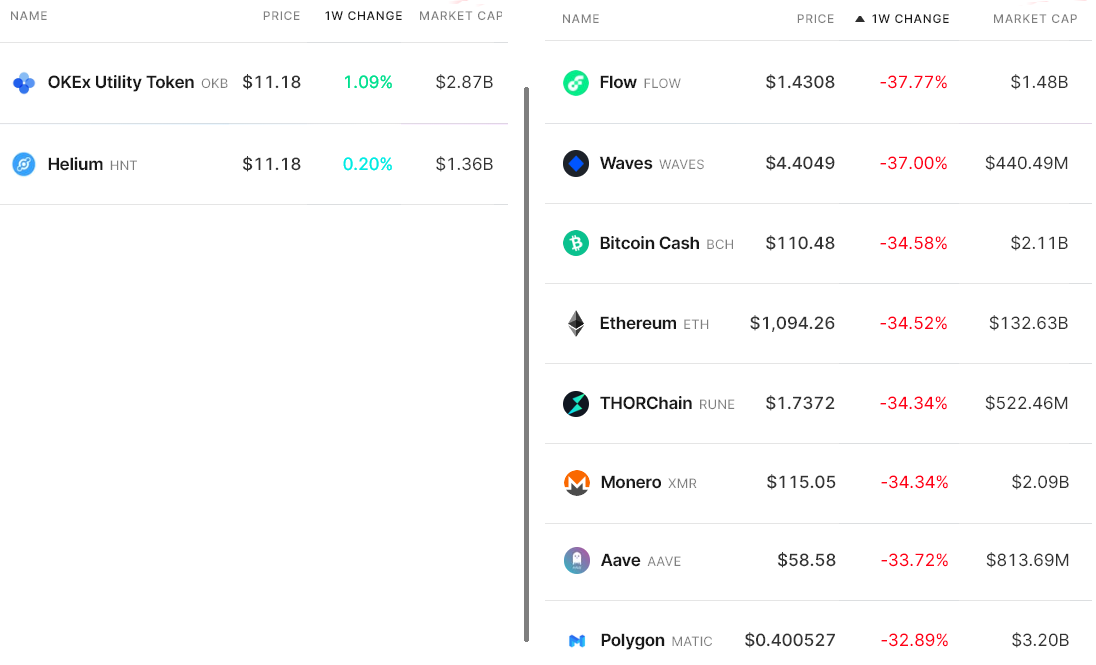 Below are the winners and losers since June 10. Curiously, Ether was the only top-10 crypto to figure on the list, which is unusual during strong corrections.