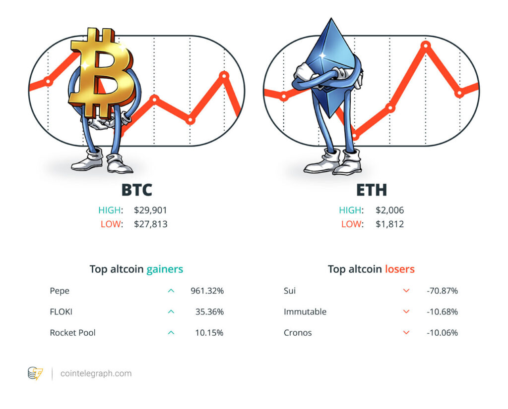 Among the biggest 100 cryptocurrencies, the top three altcoin gainers of the week are Pepe (PEPE) at 961.32%, FLOKI (FLOKI) at 35.36% and Rocket Pool (RPL) at 10.15%.