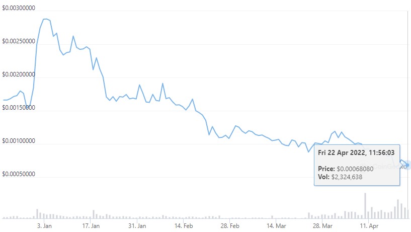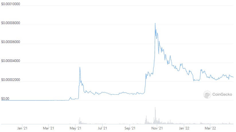 The project originally launched on March 8 and its price rapidly climbed from sub $0.00000006 to an all-time high of $0.00001399 on April 20, 2021, but it has been on a downtrend since then.