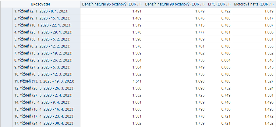 Štatistické údaje zo stránky STATdat zaznamenali pozitívny trend v priebehu posledných týždňov. V roku 2023 ceny benzínu dosiahli pomyselný vrchol počas 15. týždňa, zatiaľ čo cena nafty klesá počas celého roku každým týždňom.