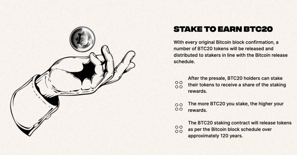 BTC20 je v istom zmysle Bitcoin, ale oveľa lepší. Token BTC20 je postavený tak, aby obstál v skúške časom. Ako základ využíva technológiu ERC-20 proof-of-stake, ktorá sľubuje, že vytvorí úplne novú generáciu Bitcoinov s pridaným prísľubom ekologickejšej siete a pasívneho generovania príjmov.
