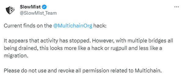 “On July 6, 2023, cross-chain bridge protocol Multichain experienced unusually large, unauthorized withdrawals in what appears to be a hack or rug pull by insiders,” the firm wrote in a July 10 blog post.