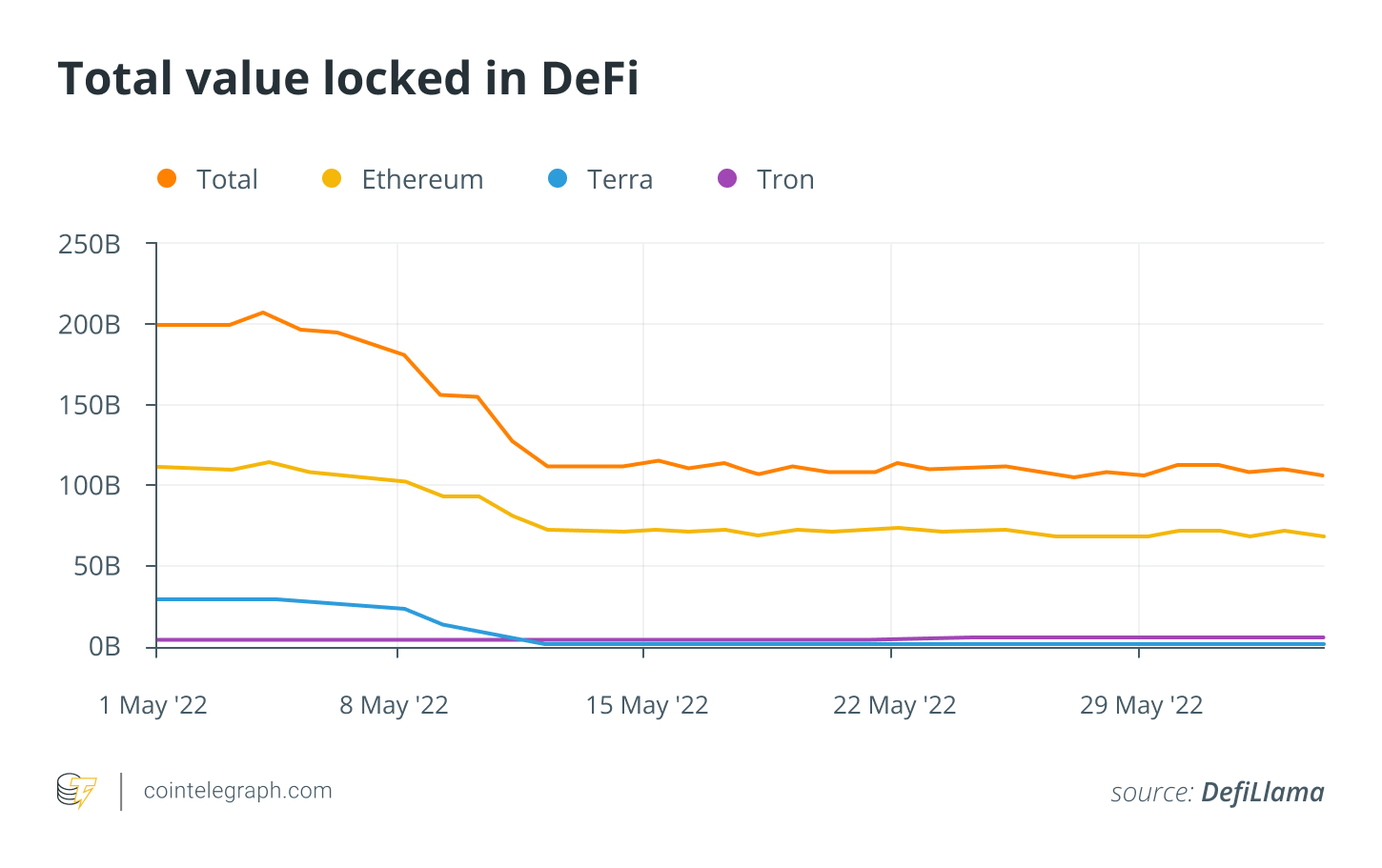 The assets deposited in Anchor have a three-week lock-up period. As a result, many users could not exit their LUNA — which has since been renamed Luna Classic (LUNC) — and UST positions at higher prices to mitigate their losses during the crash. As Anchor Protocol collapsed, its team decided to burn the locked-up deposits, raising the liquidity outflow from the Terra ecosystem to $30 billion, subsequently causing a 36% decrease in the total TVL on Ethereum.