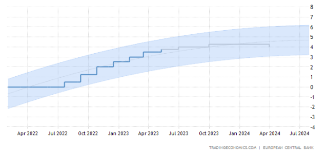 Najnovšie údaje nástroja CME Fedwatch ale naznačujú, že existuje až 79,4 % šanca, že základná úroková sadzba v USA ostane nezmenená. Dokonca aj na základe predpovede od Tradingeconomics by mala ostať úroková sadzba v USA na rovnakej úrovni. Naopak, predpoveď pre eurozónu je o čosi odlišná. Očakáva sa, že ECB pristúpi ešte ku dvom zvýšeniam o 25 bázických bodov na konečných 4,25 %.