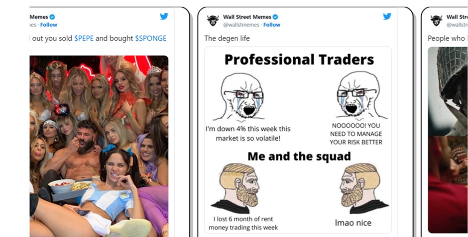 Wall Street Memes sa považuje za novú generáciu finančného sveta. V rámci jednej platformy prepája humor, internetovú silu a obchodovanie. Obsah meme obrázkov je zameraný na témy financovania či investovania. Finančné technológie, kultúra ako aj populárne akcie spojené s Wall Street, ktoré sú zobrazené v meme obrázkoch, bavia investorov po celom svete.