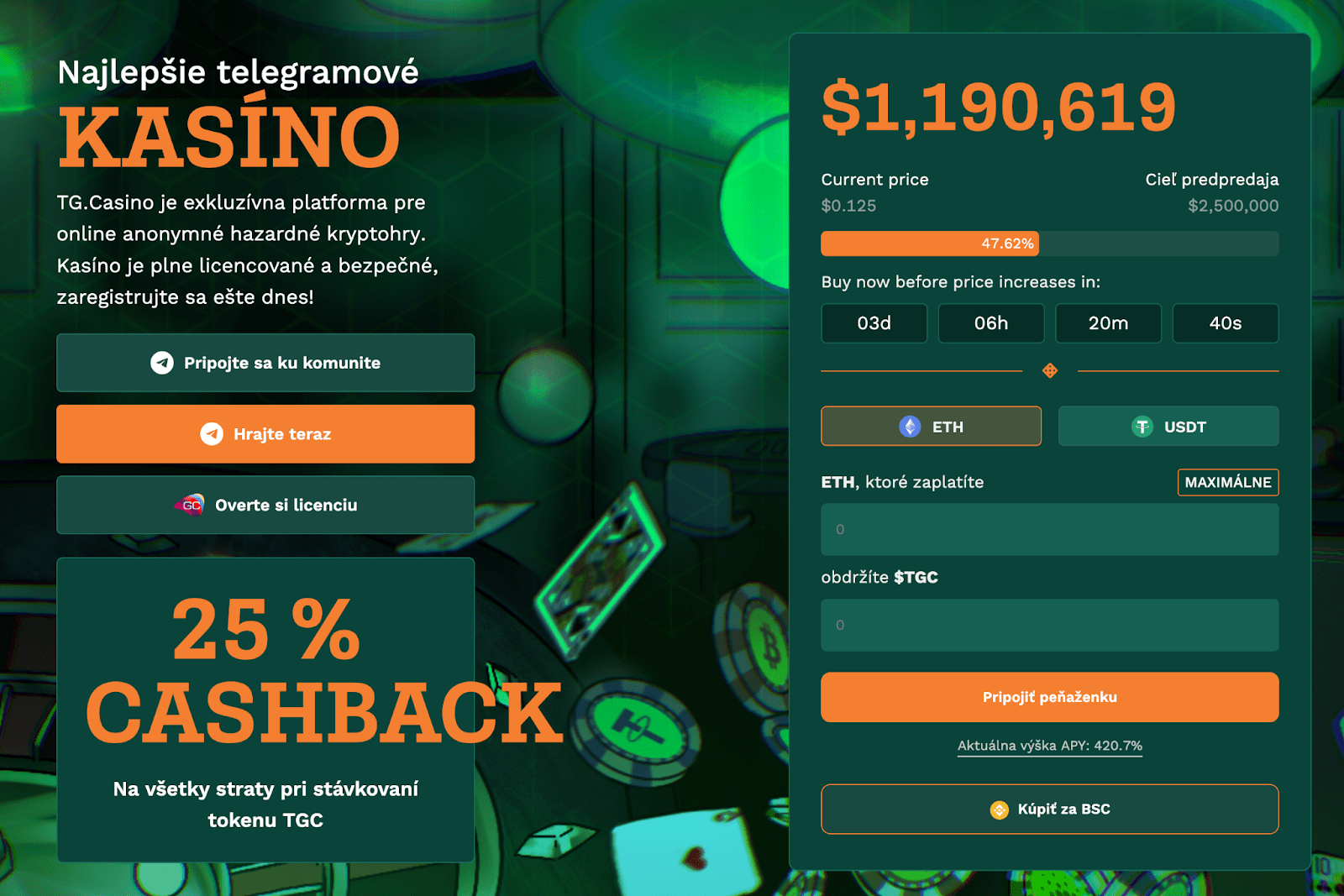 - TG.Casino – natívny token budúceho Telegram kasína, ktorý ponúkne atraktívne odmeny všetkým hráčom.