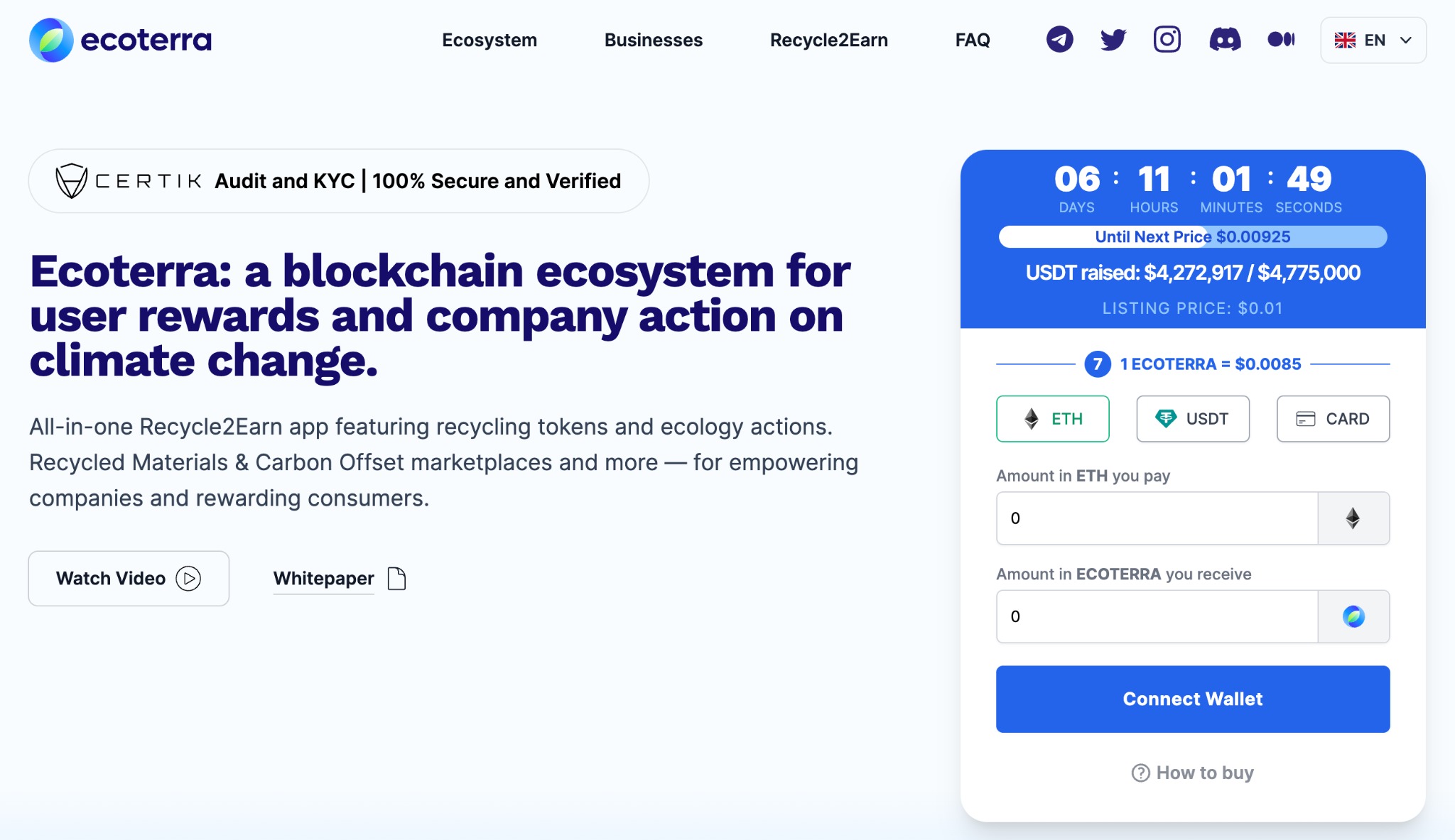 V tejto fáze predpredaja sa tokeny predávajú len za 0,0085 USDT za kus. Každá úroveň predpredaja má progresívnu cenovú štruktúru, ktorá umožňuje skorým investorom využívať výhodnejšie ceny. Svoju kryptopeňaženku môžete pripojiť k predpredaju a zakúpiť si tokeny $ECOTERRA pomocou ETH, USDT alebo kreditnej/debetnej karty.