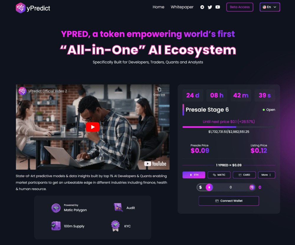 Rovnako ako v prípade predchádzajúcich projektov je yPredict v štádiu predbežného predaja. V súčasnosti si môžete kúpiť jeho natívny token $YPRED za 0,09 $. V ďalších fázach predpredaja sa však cena opäť zvýši. Využite preto skvelú príležitosť investovať práve dnes.