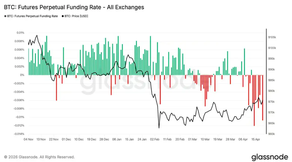 Metrika z Glassnode upozorňuje, že Bitcoin zaznamenáva viaceré týždne záporného funding rate — teda stavu, keď na trhu dominujú short pozície, pretože dlhé pozície dostávajú platby za ich držanie. Rastúci počet predajcov nakrátko môže čiastočne súvisieť s tým, že vývoj ceny za posledné tri mesiace pripomína konsolidáciu z novembra 2025 až januára, ktorá predchádzala februárovému prepadu.