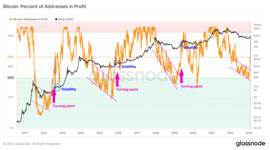 Metrika ziskových bitcoinových adries atakovala úroveň 70 %, čo hovorí o zlomovom momente volatility. Identické situácie nastali aj v minulosti, kedy bitcoin definitívne potvrdil dno korekcie. Napriek tomu v modrých kruhoch môžeme vidieť, že odraz od minima bol vždy sprevádzaný konsolidáciou ceny.