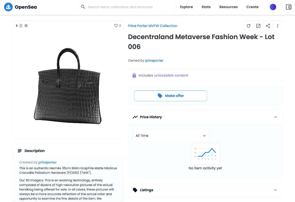 In addition to digital wearables displayed on 3D avatars, MVFW featured pop-up shops from retailers selling NFT accessories tied to physical items. For example, Privé Porter, a global leader in luxury collectible accessories, planted its luxury resale pop-up shop in Decentraland’s Threedium Plaza. During the four-day event, Privé Porter featured four 3D NFT Hermès bags exceeding $500,000 in value.