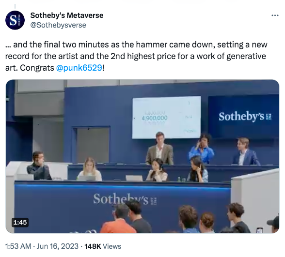 Sotheby’s applies the same traditional buyer’s premium revenue model to their digital art auctions as their physical art auctions. But Bouhanna points out the Sotheby’s brand helps artists attract premium prices too.