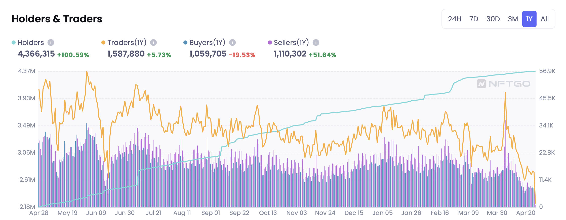 Days before, on April 19, the NFT market hit its second lowest point in the past twelve months, with only 5,893 buyers – a slight increase from the lowest recorded date in the past twelve months, which was on June 18, 2022, with 5,343 buyers.
