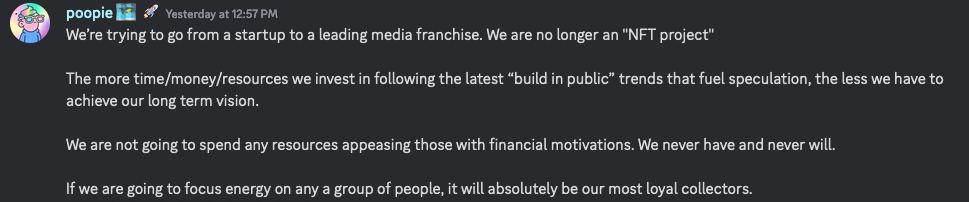 In a March 18 post on the project’s Discord, one of the doodle’s founders, Jordan Castro — who goes by the pseudonym “poopie” online — said it wanted to move away from financial speculators.