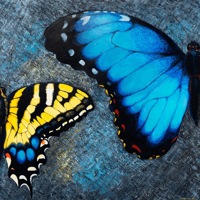 Among the four works of art will be three paintings and one photograph that heavily incorporate the colors blue and yellow like the national Ukrainian flag. The auction will take place online and the gallery is based in Australia.