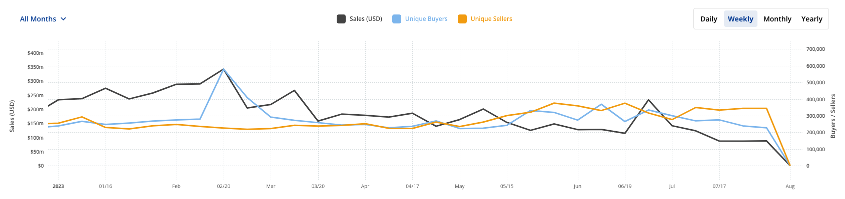 NFT volumes have continued to slide in the ongoing bear market, having sank by almost half over July.