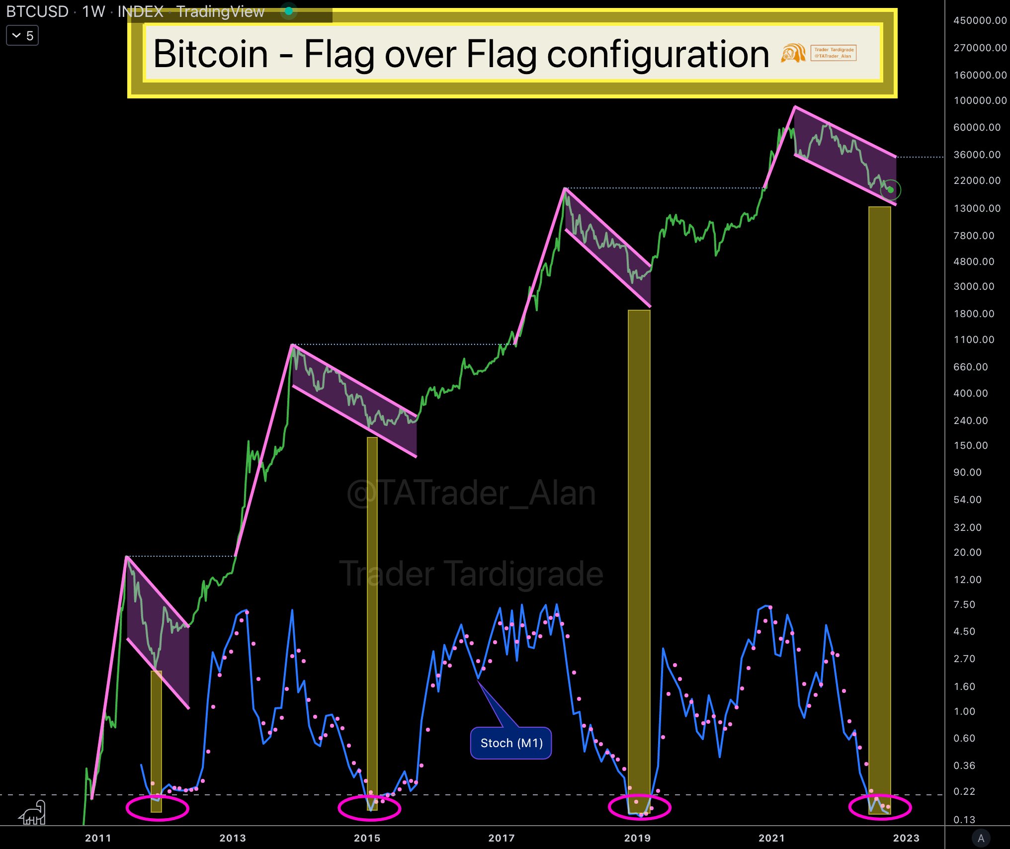 “Bitcoin forms Flag over the previous Flag configuration. Yellow zone form Stochastic indicator shows (at least) second half of the flag, where we are right now,” he commented alongside the chart.