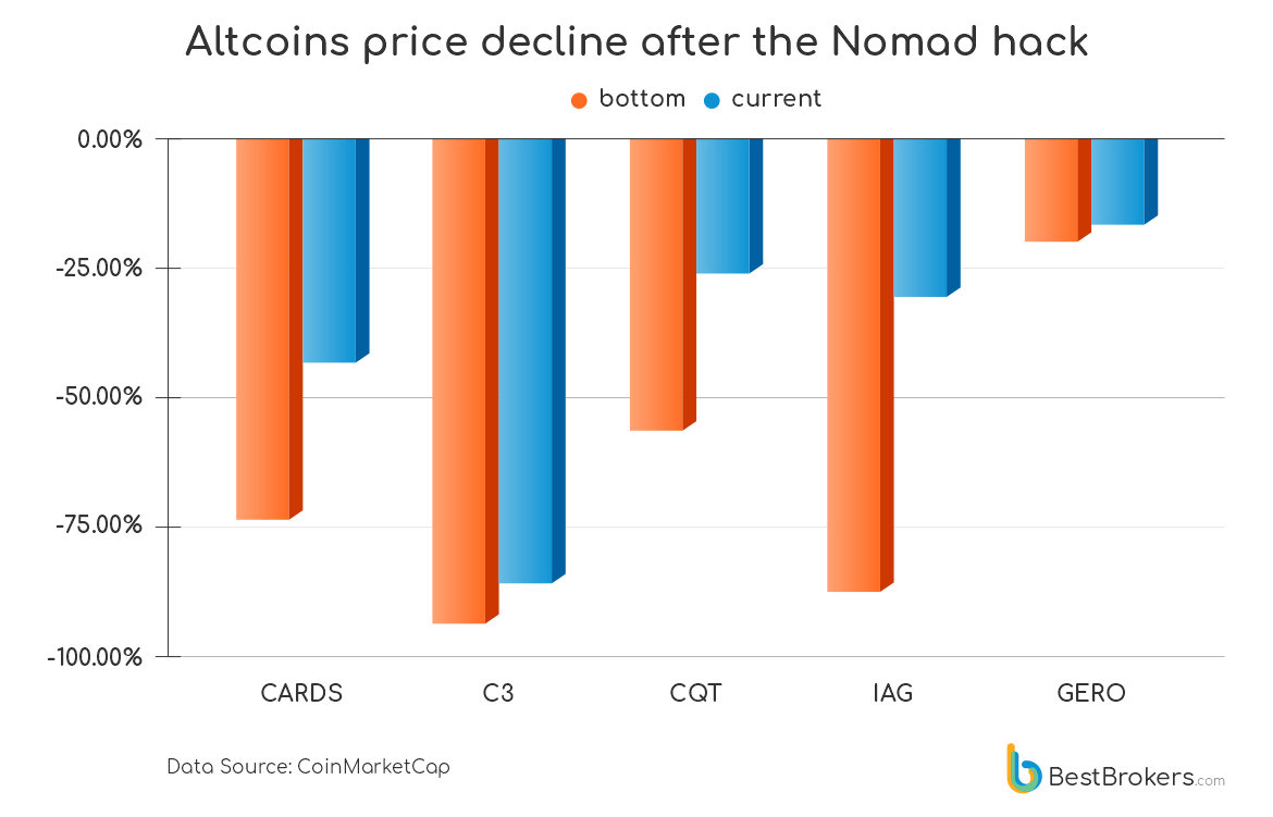 Some altcoins that were stolen from the platform suffered as much as a 94% decline. Data collected by the analysis firm showed that the following altcoins suffered the biggest collapse after the hack: