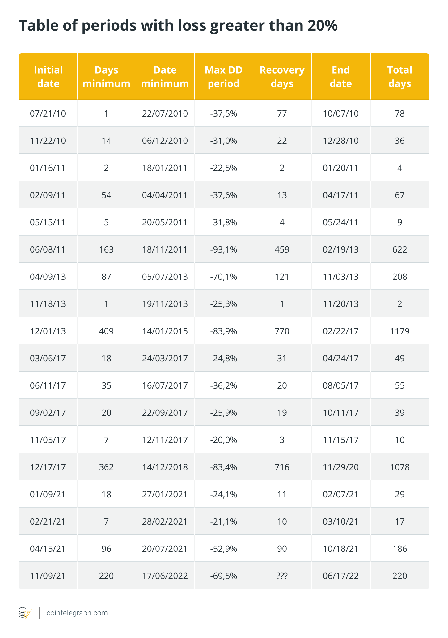 The bad news is that Bitcoin (BTC) has lost more than 90% of its value on one occasion, more than 80% on two other occasions, hitting during this period a performance percentage of -75%. But the good news is that it has always recovered (at least so far) from losses in a very reasonable timeframe — even the heaviest losses.