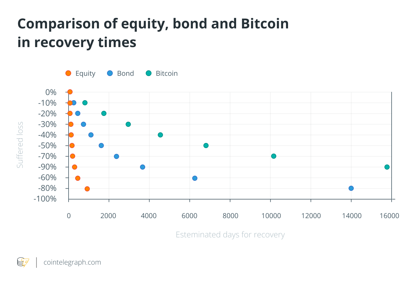 To reiterate, however, the difference between Bitcoin and the other two asset classes (equities and bonds), I have compared the three on this graph of relationship between loss and recovery time: