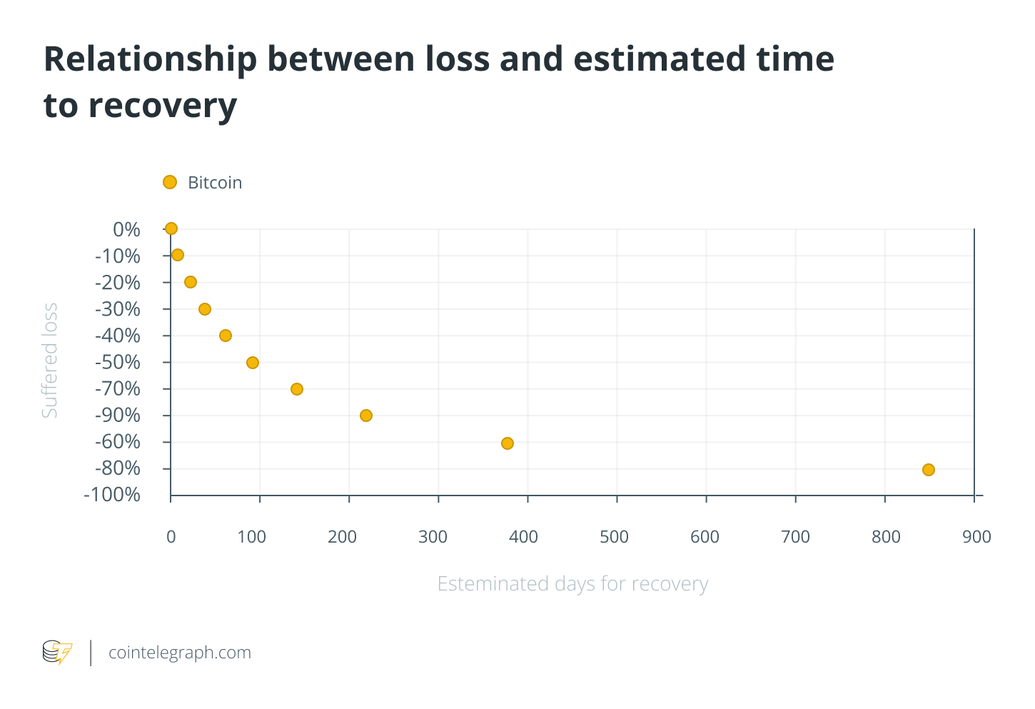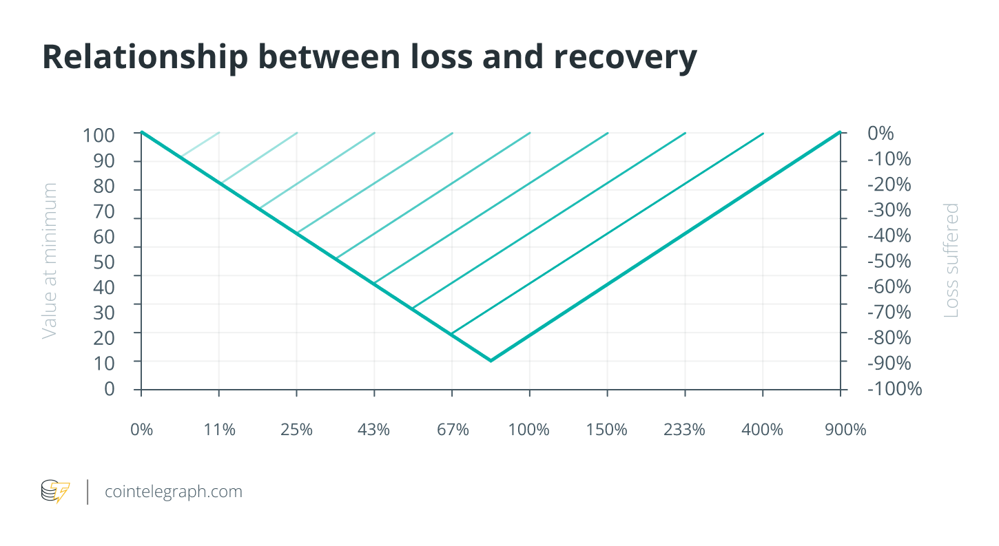 https://images.cointelegraph.com/images/840_aHR0cHM6Ly9zMy5jb2ludGVsZWdyYXBoLmNvbS91cGxvYWRzLzIwMjItMDcvMmNjZWU5ZDYtZGM2Mi00Nzc5LThjZTAtYjk2ZThjNTY3MjJhLmpwZw==.jpgWhen investing in financial markets, people often underestimate the possibility that, over a period of time, the investment may lose its value, and it will take time to recover temporary losses. The deeper the loss becomes, the more energy required to recover the losses increases out of proportion. If I invest $100 and lose 10%, I end up with $90 (whether I keep the investment or liquidate it). So, to get back to $100, which returns do I have to make? I have to make 11% because, with a base of $90, if I make 10%, I end up with $99. This effect is amplified if I lose 20% — to get back from $80 to $100, I will have to make 25%.