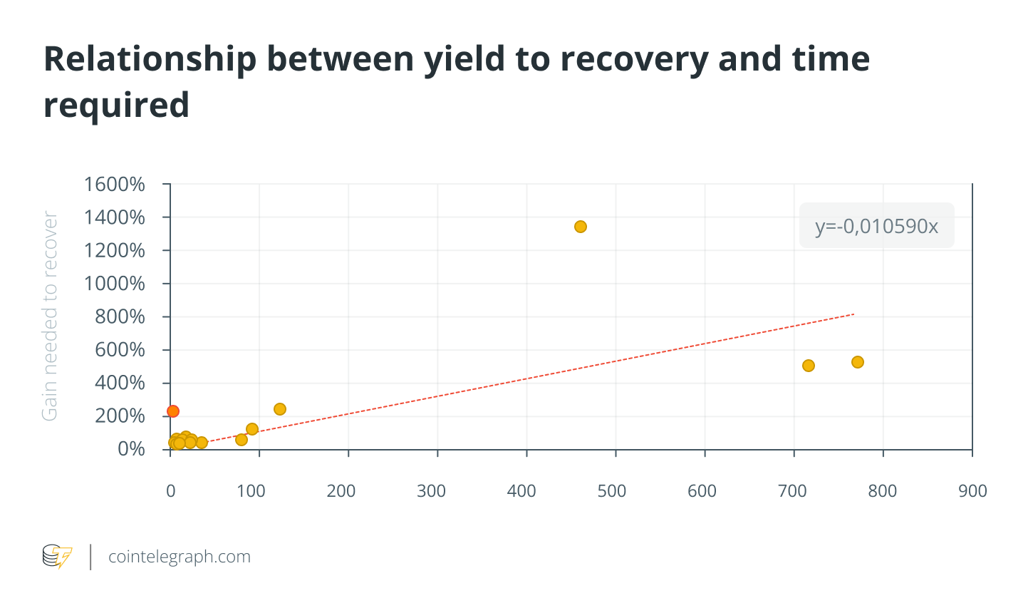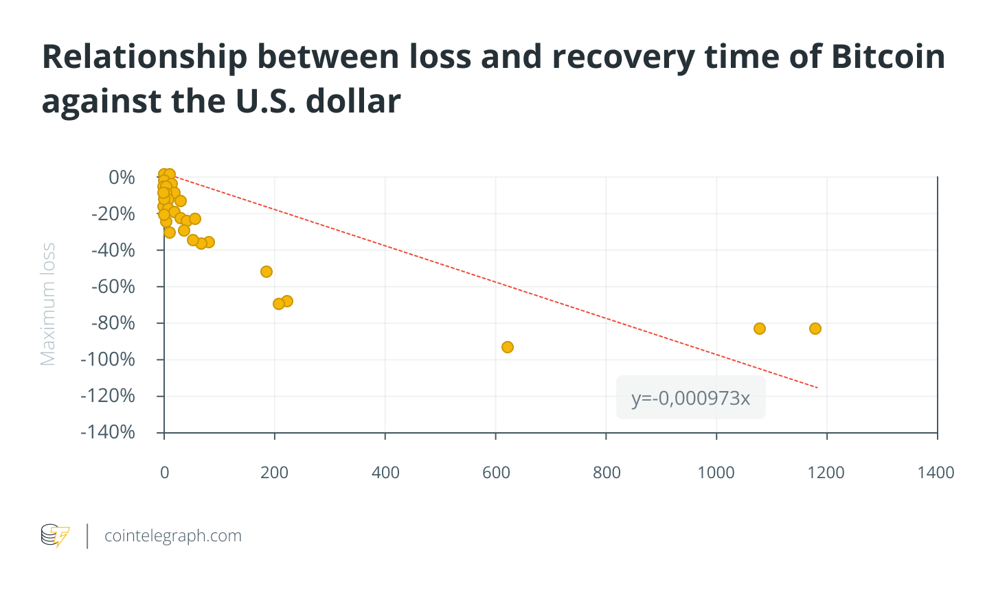 From the graph above, a regression can be extracted that explains Bitcoin’s relationship to the time it took to recover a new high from the relative low. To give an example, assuming and not granting that Bitcoin has hit lows of about $17,000, the recovery it needs to make to get back to the highs is 227%. So, the following the formula can be derived from the regression line described in the graph: