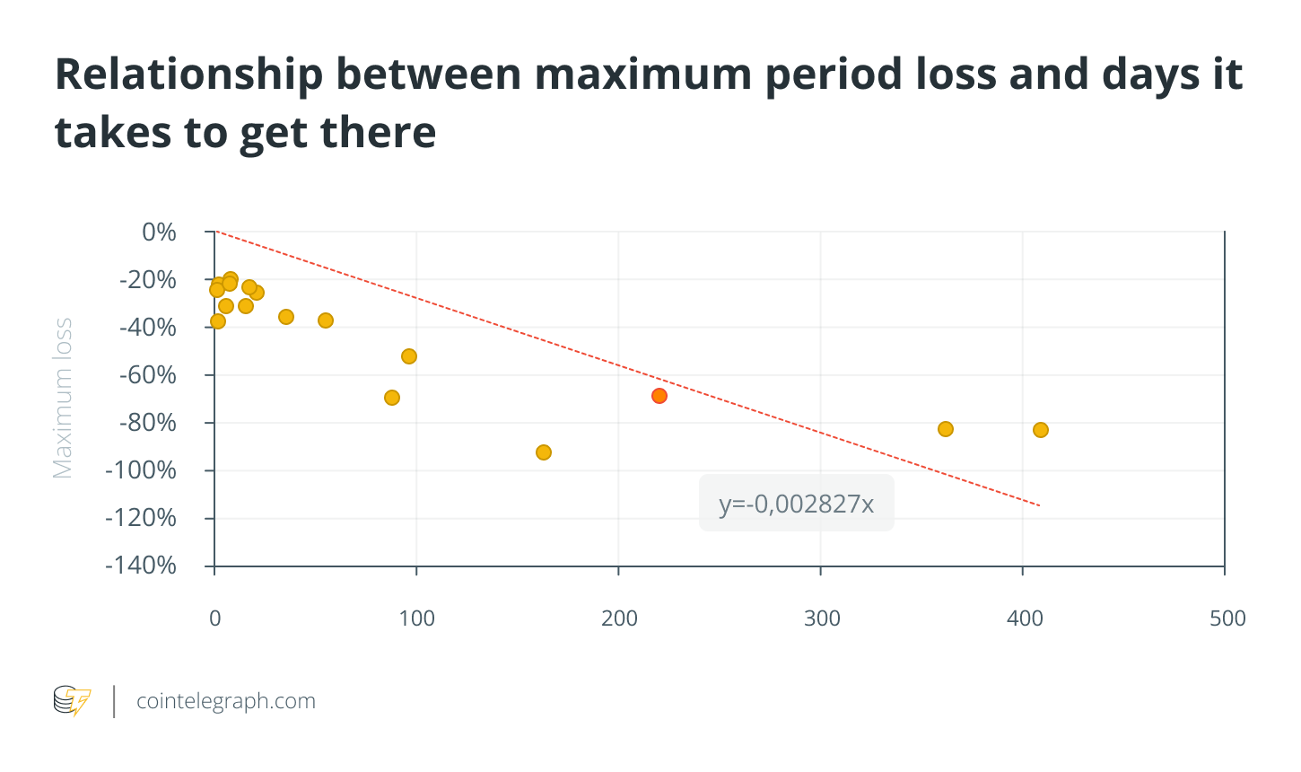 As can be seen, the days it takes to have a 40% or greater loss often number less than three months. The darker dot is the current drawdown suffered by Bitcoin since the November highs, or about 220 days so far, making it in line with the regression line that determines (to simplify) an average value of the relationship between losses and the time to get there.