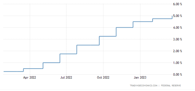 Podľa stránky Tradingeconomics sa úrokové sadzby vyšplhali už na úroveň 5 %, pričom na grafe nižšie môžete vidieť postupné navyšovanie v priebehu posledných mesiacov. Ak by FED pristúpil k ponechaniu úrokových sadzieb, bolo by to prvýkrát za posledných 10 stretnutí FOMC.