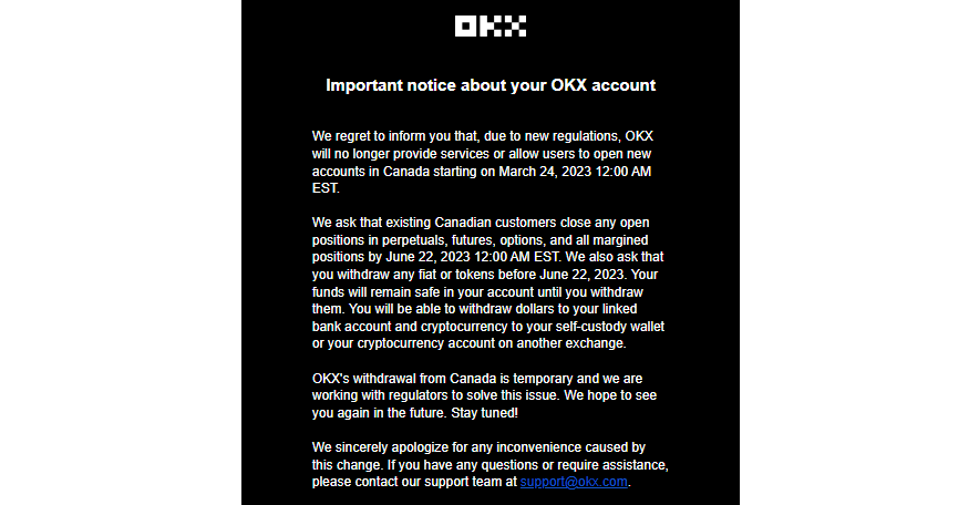 On Mar. 20, cryptocurrency exchange OKX informed Canadian users via email the firm “will no longer provide services or allow users to open new accounts in Canada starting on Mar. 24, 2023, 12:00 AM EST,” citing “new regulations.” According to OKX, existing Canadian customers must close open positions in options, margins, perpetual, and futures by June 22, 2023. Fiat or tokens must also be withdrawn by the said date.