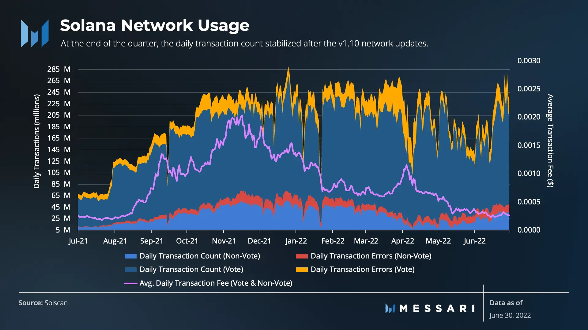 “It appears that the network showed signs of stabilization post-v1.10 as lower transaction fees occurred and the daily transaction count reversed the trend between the middle of May and the end of June,” noted James Trautman, a researcher at Messari, in his Solana Q2 report.
