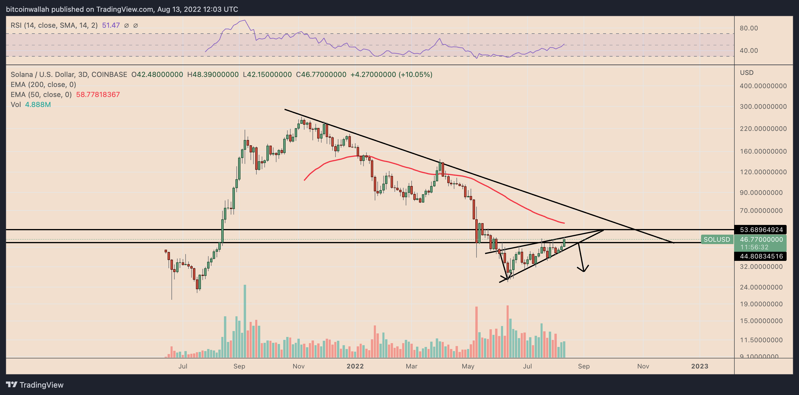 A decisive breakout above the upper trendline would invalidate the bearish reversal setup, if SOL rises to the 50-3D exponential moving average (50-3D EMA; the red wave) near $58.