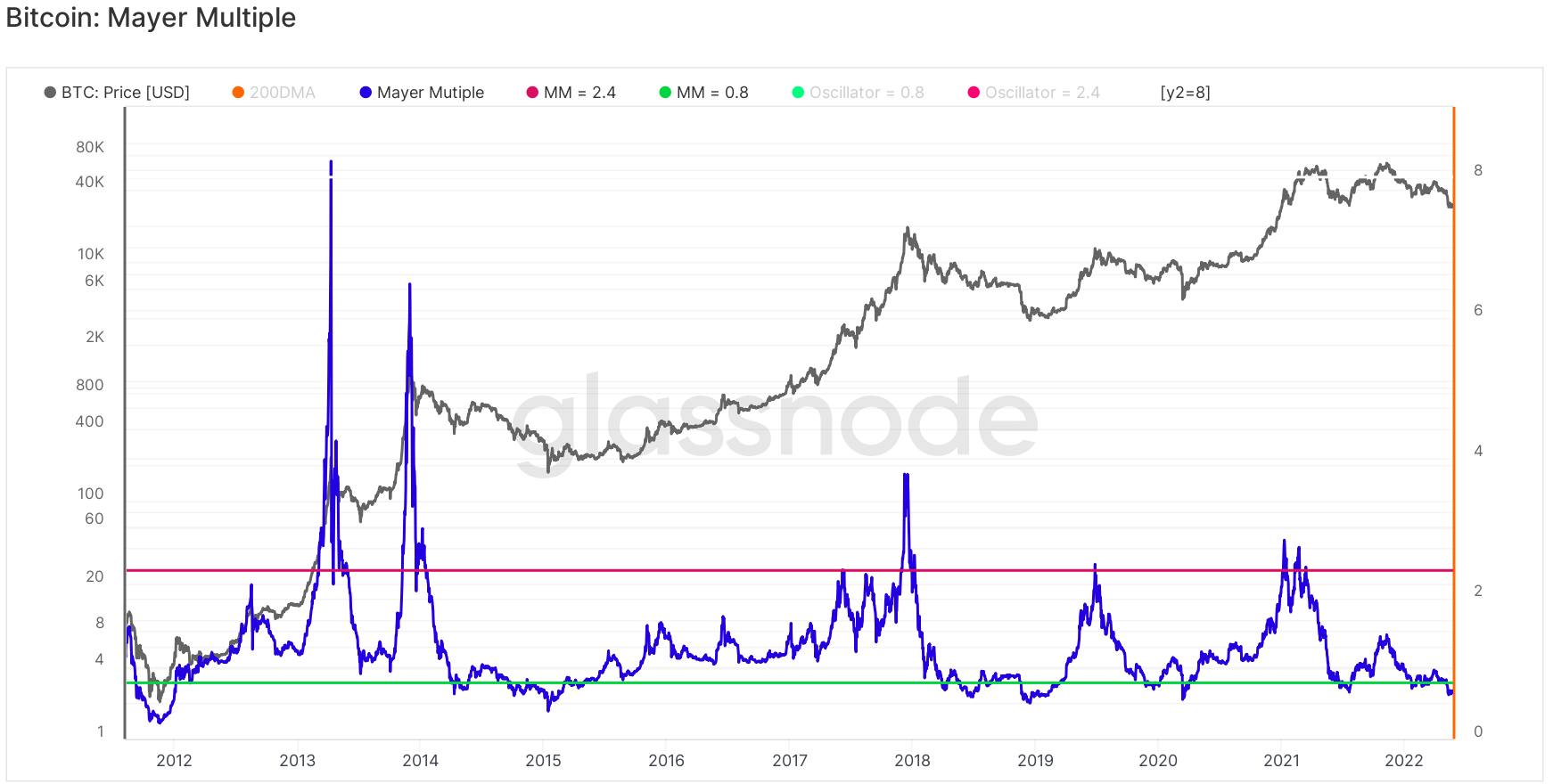 Blockware Solutions, likewise, sees several data points that suggest the market may be in search of a bottom, including the Mayer Multiple, a metric that compares the current market price to the 200–day moving average, which is currently “near some of the lowest readings on record.”