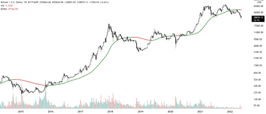 This includes the fact that Bitcoin started off 2022 at $46,200 while the 180-week exponential hull moving average, which gives more weight to recent price action, indicates that the moment for BTC is declining and currently sits at $47,166.