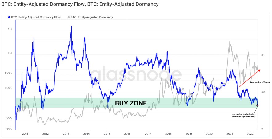 To further support the claim that Bitcoin is currently in a good buy zone, the report pointed to the entity-adjusted dormancy flow, which has been consolidating within an area that has previously been considered a optimal purchase zone.