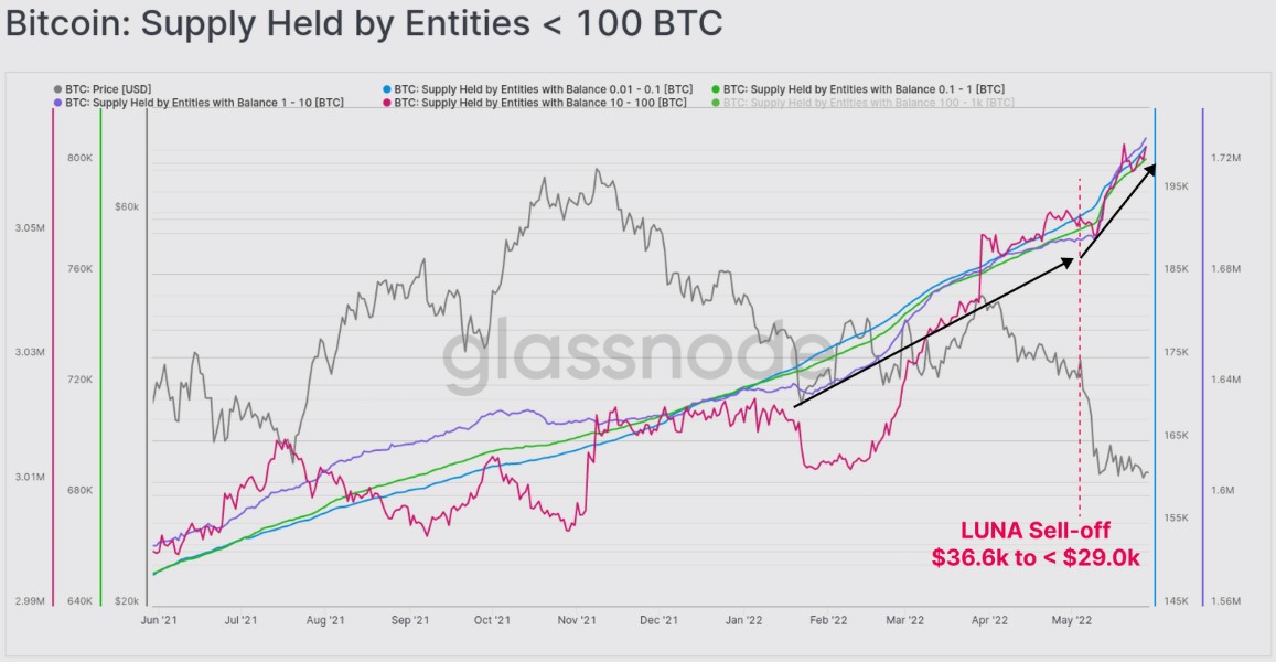 In the recent volatility, the aggregate balance of entities holding less than 100 BTC increased by 80,724 BTC, which Glassnode noted was “remarkably similar to the net 80,081 BTC liquidated by the LUNA Foundation Guard.”
