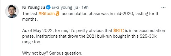 The idea that Bitcoin is currently in an accumulation phase was also noted by CryptoQuant CEO Ki Young Ju, who posted the following tweet asking his Twitter followers “Why not buy?”