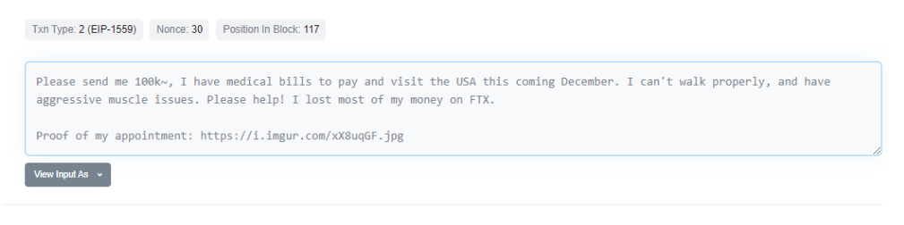 Inside each transaction was a UTF8 encoded message that said “Please send me 100k~, I have medical bills to pay and visit the USA this coming December. I can’t walk properly, and have aggressive muscle issues. Please help! I lost most of my money on FTX.”