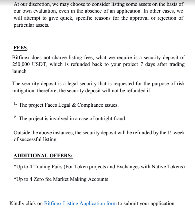 Legitimate exchanges do not generally require initial deposits or listing fees. Instead, a due diligence team reviews the potential token for security, compliance, legal framework and the overall project utility, and then schedules a meeting with the asset issuer to discuss further steps. Depending on the scale of a project, developers can be hassled by so-called fake listing proposals on a daily basis.