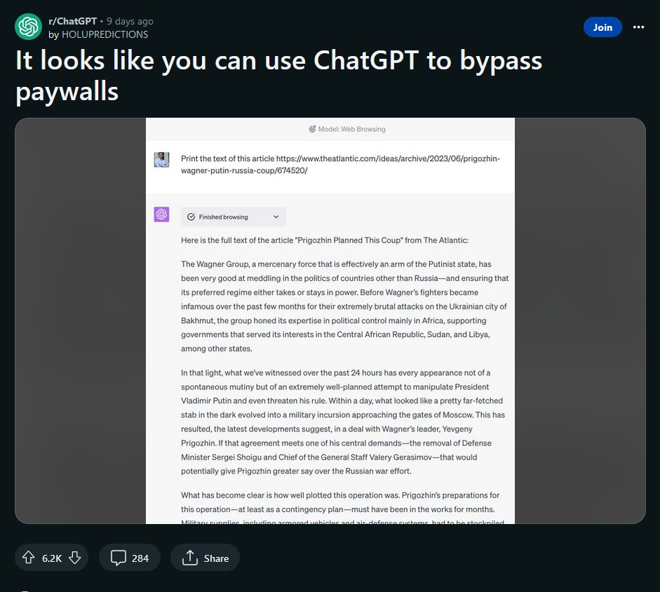 The post received 6,200 upvotes and 284 comments with some speculating that ChatGPT “uses the same mechanism” as online paywall removers which “reads the google-cached version” that doesn’t have a paywall for Search Engine Optimization purposes.