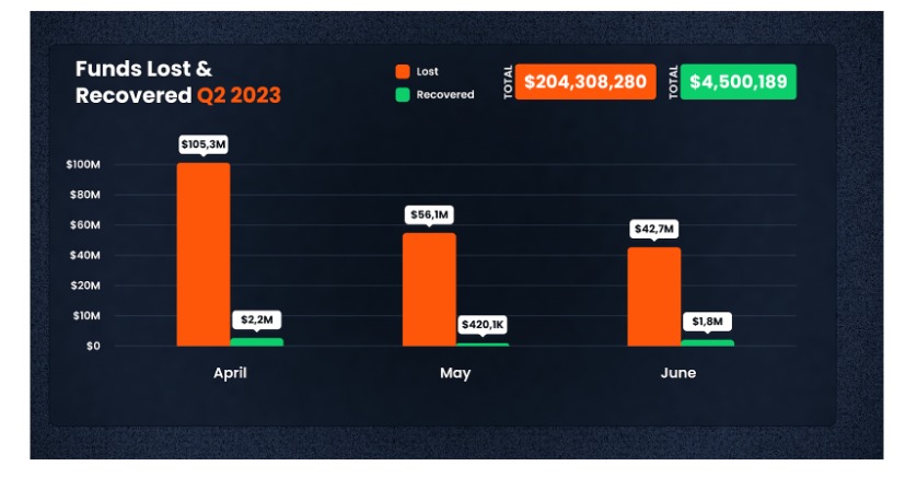 https://images.cointelegraph.com/cdn-cgi/image/format=auto,onerror=redirect,quality=90,width=840/https://s3.cointelegraph.com/uploads/2023-06/f2cb2d98-35a8-43a1-98b5-f19046e0161e.jpgMore than $208.5 million was lost initially, but approximately $4.5 million was recovered, making the total amount of unrecovered funds over $204 million.