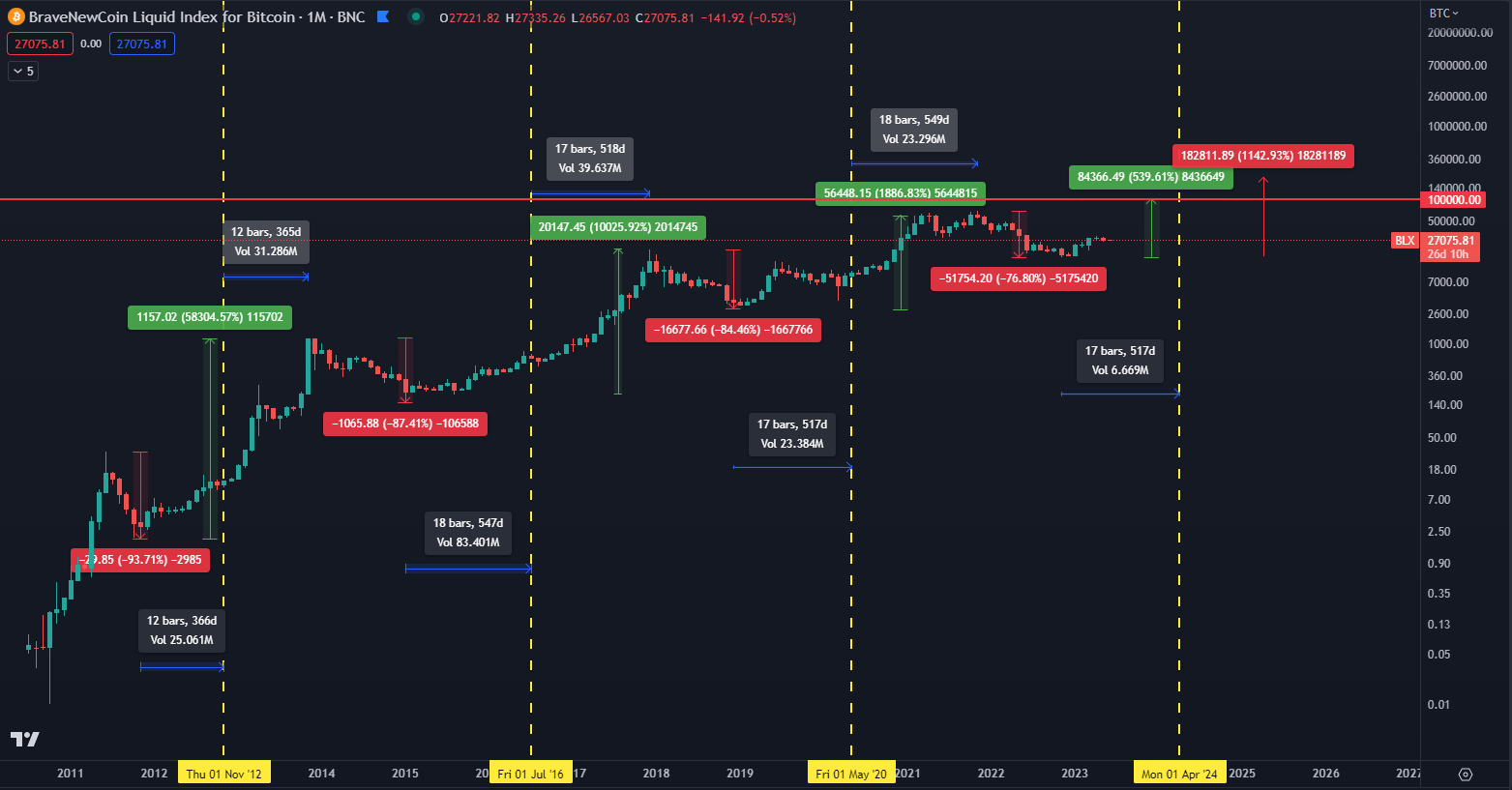 Graf nižšie zobrazuje halvingové cykly na logaritmickom mesačnom grafe. Ako vidíme, bitcoin by sa mal nachádzať v počiatočnej fáze bullrunu a ďalší rok by mal prevažne rásť. Halving bitcoinu je najdôležitejšia udalosť na celom kryptomenovom trhu, pretože spôsobuje cenový rast, ktorý ovplyvňuje všetky digitálne meny. Viac sa o tom môžete dočítať v článku Čo je to halvingový cyklus a prečo výrazne ovplyvňuje cenu Bitcoinu?