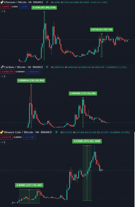 Pre lepšiu predstavivosť si porovnáme percentuálne zisky týchto troch altcoinov voči bitcoinu v dvoch posledných cykloch: