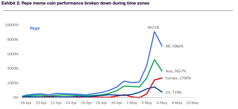Additionally, the report found that the largest driver of Pepe’s meteoric price action since its inception on April 14, seems to be coming from traders based in Asia. According to Matrixport, buying activity during Asian trading hours contributed a staggering 3,657% to the total 9,071% rally witnessed by the memecoin as of May 8.