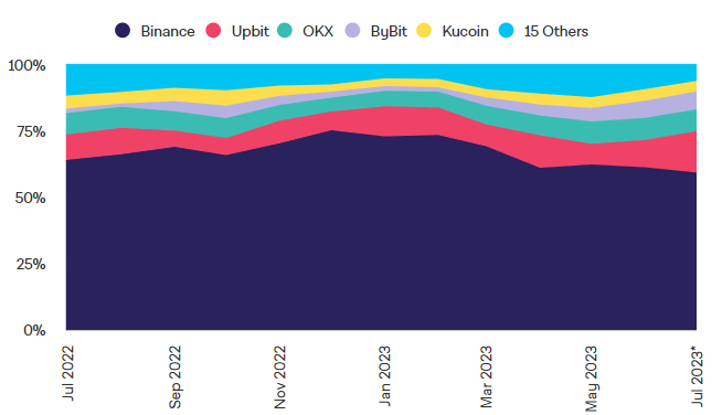 Trhový podiel najväčšej kryptomenovej burzy na svete, Binance, klesol z hodnoty 72 % na 58 % len počas roka 2023. Podľa správy The Block zo spoločnosti odchádzajú manažéri a burza čelí zatiaľ najväčšiemu regulačnému tlaku. Napriek tomu si spoločnosť dodnes drží najväčšie obchodné objemy na trhu.