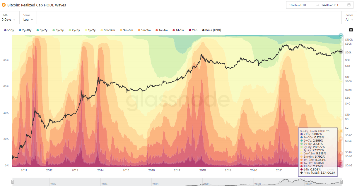 Podľa metriky Realize Cap HODL Waves od Glassnode došlo k najvyššiemu percentuálnemu nárastu skupiny, ktorá drží bitcoin 2 až 3 roky (svetlo zelená na grafe). Ešte v novembri 2022, keď bitcoin dosiahol najnižšie minimum v minulom roku, podiel tejto skupiny predstavoval iba 3%. K dnešnému dňu rovnaká skupina dosahuje podiel už 28 %.
