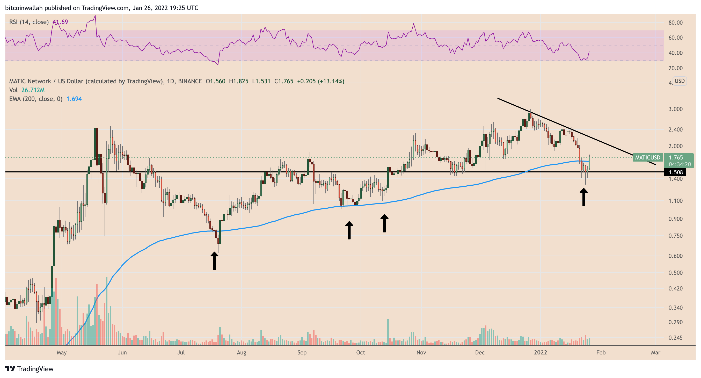 https://images.cointelegraph.com/images/840_aHR0cHM6Ly9zMy5jb2ludGVsZWdyYXBoLmNvbS91cGxvYWRzLzIwMjItMDEvMDlmNmY2YjgtNGQxZC00YjQzLWJjMjgtYTk4YTE4NWVlZWU0LmpwZw==.jpgPolygon (MATIC) emerged as one of the best performers among high-ranking cryptocurrencies on Jan. 26 as the price rose nearly 17% to reach an intraday high at $1.825.