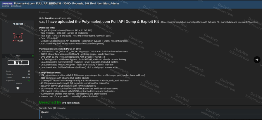 Cybersecurity company Vecert Analyzer and several other X accounts that track dark web activity shared screenshots from DarkForums on Tuesday showing a hacker using the pseudonym “xorcat” claiming to have breached Polymarket.