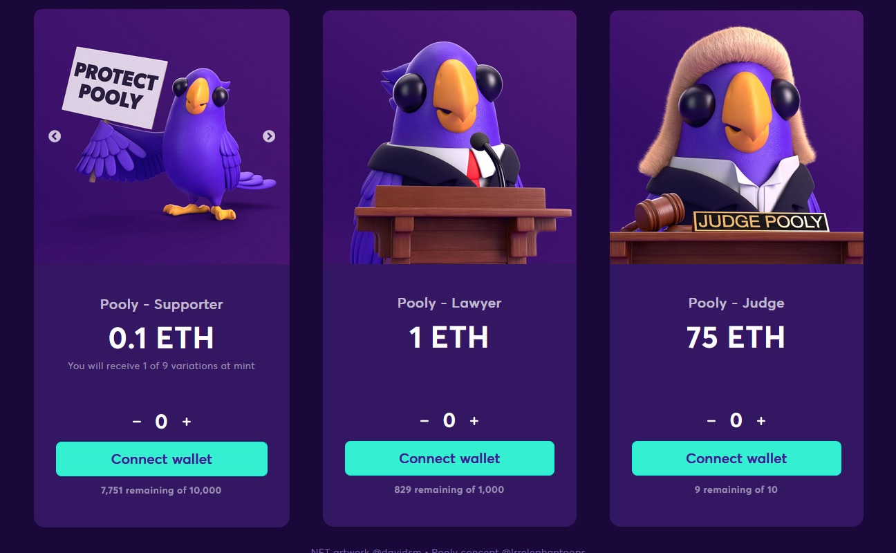 The NFTs depict an purple animated avatar called “Pooly” and come in three types of rarity and pricing, with the supporter tier consisting of 10,000 NFTs going for 0.1 ETH apiece, the lawyer tier of 1000 NFTs for 1 ETH per token and the judge tier of 10 NFTs in total going for 75 ETH a pop.