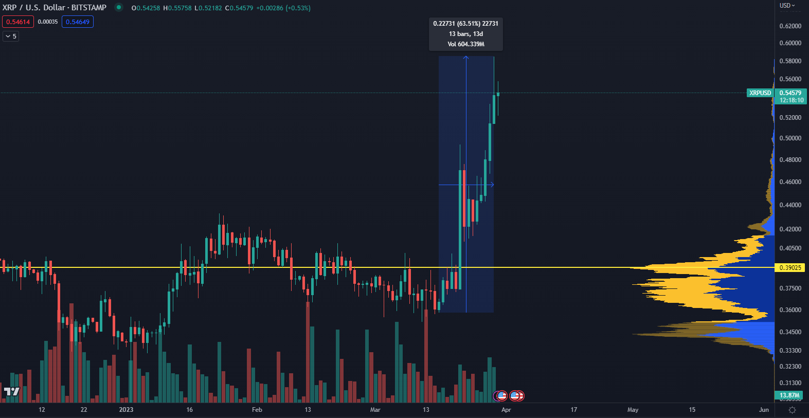 Podľa údajov z TradingView, je trhová cena tokenu 0,54 dolára. Iba v priebehu dvoch týždňov sa podarilo na trhu zaznamenať zisk 63,50 %, čo zabezpečilo, že XRP prekonal ziskovosť najväčších kryptomien na svete.